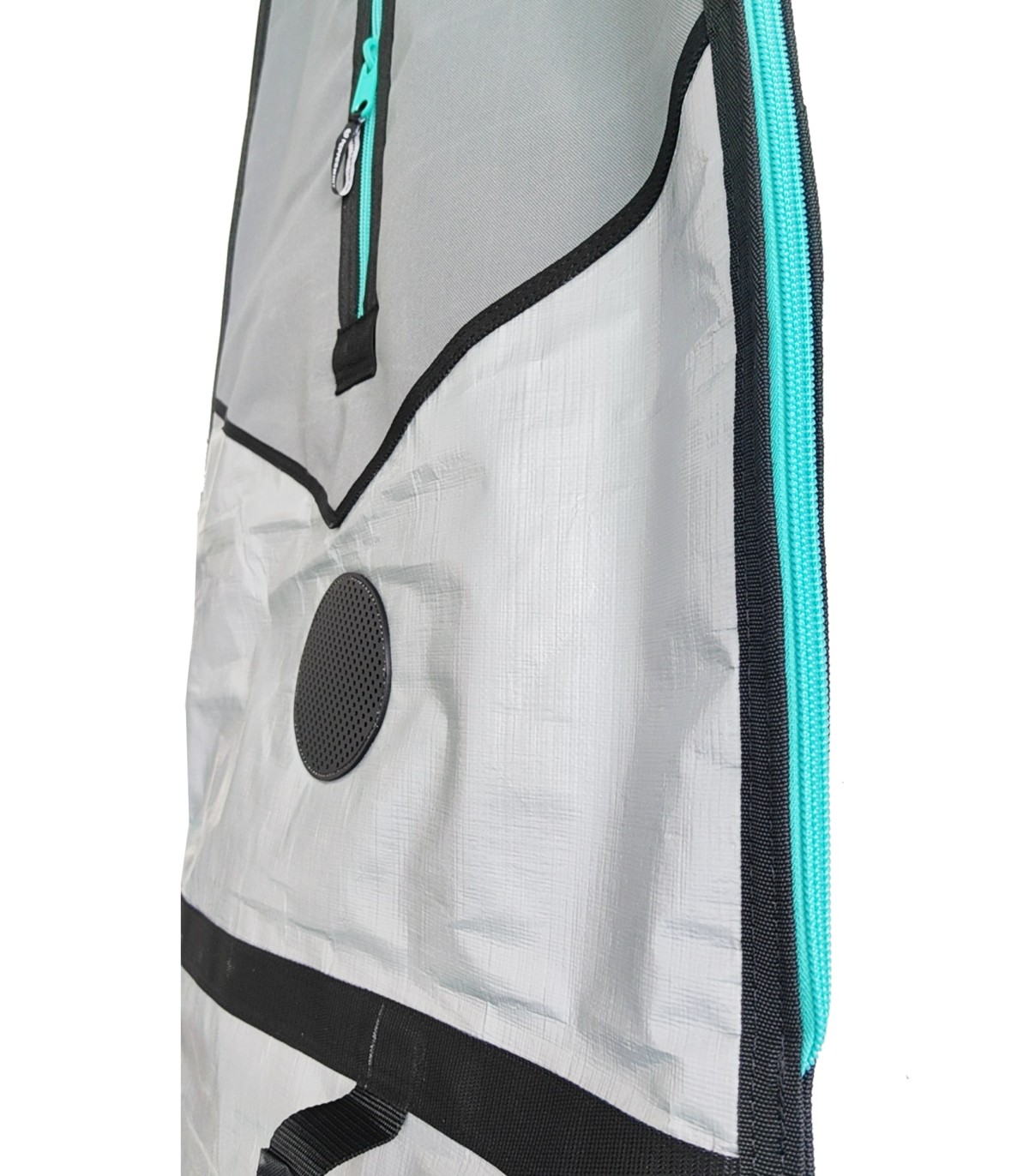 Para mayor comodidad, la hemos equipado con una correa de hombro acolchada y desmontable, así como con múltiples asas de transporte. Dispone de un bolsillo interior para guardar quillas y cera. Está ventilada mediante 4 válvulas que permiten respirar a tu tabla y evacuar la humedad.