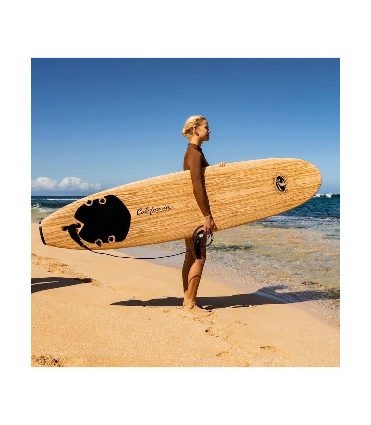 El Soft Surf Bear 7' CBC California Board Company en espuma EPS es la tabla ideal opara iniciarse y progresar de la manera la más segura posible. Fabricada con espuma EPS de alta densidad, es robuta y adecuada para todo tipo de surfistas ligeros o con mas peso para surfear en olas de 50 cm a 1 m 20. Es conocida por su facilidad de uso, su durabilidad, su divertido gráfico de madera que cubre toda la parte superior de la tabla y su precio asequible. Esta tabla de surf soft tiene un núcleo de espuma EPS impermeable con 3 almas de madera incorporadas para una estructura con flexibilidad, un deck en XPE / IXPE que apenas necesita cera para agarrarse y una carena dura de polietileno resbaladizo que se desliza suavemente sobre el agua. También cuenta con un deck pad en la parte trasera, un sistema tr-fin fácil de instalar y quitar; y viene con un leash de surf con una correa de tobillo acolchada de neopreno.